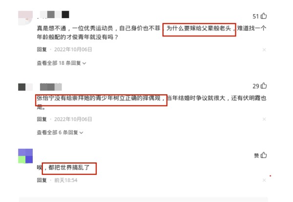 然而,一些网友却不太看好这段婚姻,他们不明白张怡宁为什么要找个比自己大那么多的,在努力点都能当爹了,并且还批判张怡宁给喜欢她打球的青年粉丝们树立了不良的择偶观。