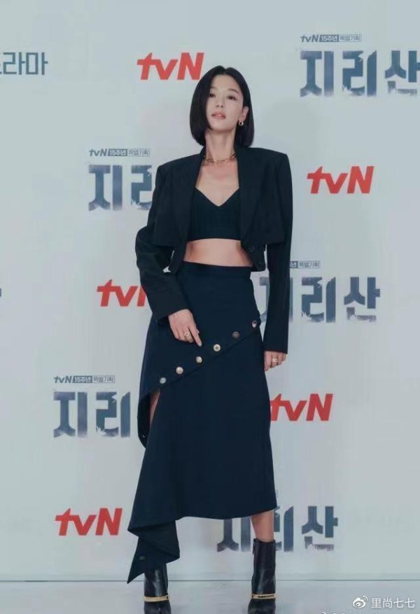 大面积黑色的穿搭很容易就会形成中性风格表达,尤其是在审美多元化的时代,女性的穿搭风格不再局限于性别,对于全智贤 这种气质几乎可以驾驭所有风格。