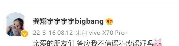 近日,龚翔宇在社交平台上发布了一条动态,带有恳请的意思。内容如下:亲爱的朋友们 答应我不信谣不传谣好吗?看到这条动态,说实话,第一感觉就是龚翔宇这是怎么啦,是有什么样的谣言让她要站出来辟谣。第二感觉就是龚翔宇好可爱好温柔,动态都能如此。