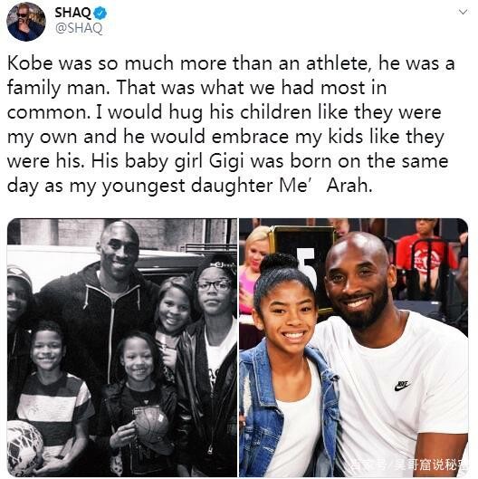 奥尼尔在推特发文:“科比绝对不仅仅是一名运动员,他还是我的家人。我会像拥抱自己孩子一样拥抱科比的孩子,反之亦然,这是我们的共通之处。他的女儿吉安娜跟我最小的女儿Me’Arah生于同一天。”