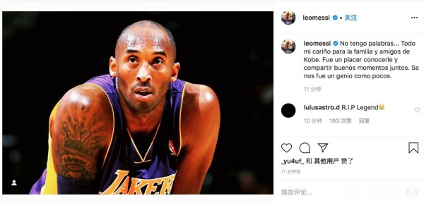 足球巨星梅西在ins写道:“我说不出话来……向科比的家人和朋友致以我最真诚的问候。很高兴认识您并与您一起度过很多愉快的时光。一位少有的天才离我们而去。”