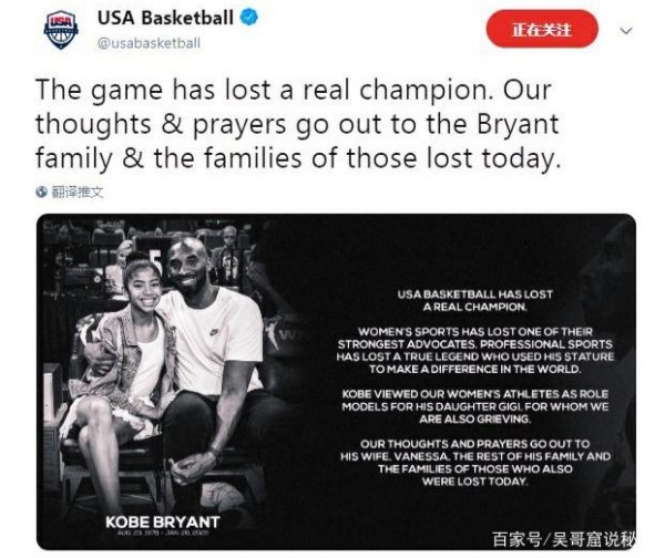 美国男篮也在官方发文:“这项运动永远地失去了一位冠军。美国男篮永远地失去了一位冠军。女子运动失去了她们最坚定的拥护者。职业体育界失去了一个声望足以改变世界的传奇。