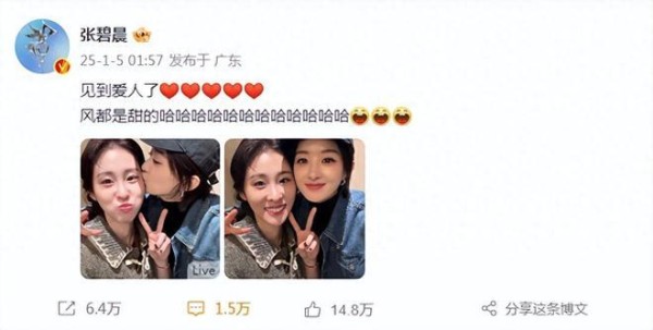 1月5日凌晨,整个娱乐圈似乎还在沉睡之中,歌手张碧晨的一条社交平台动态却像一颗炸弹瞬间炸开了锅。她分享了两张与闺蜜赵丽颖的合照。照片中的画面美得就像一幅画,赵丽颖温柔地搂着张碧晨,两人的笑容如同春天盛开的花朵一样灿烂,那整齐划一的剪刀手,仿佛是她们之间专属的小暗号,将她们之间深厚的闺蜜情展现得淋漓尽致。