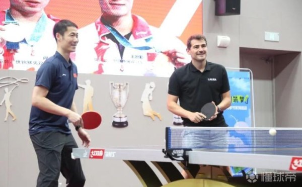 在参观乒博馆的活动中,西甲三位传奇球星卡西利亚斯、莫伦特斯和路易斯-加西亚与王励勤和闫森切磋乒乓球技。