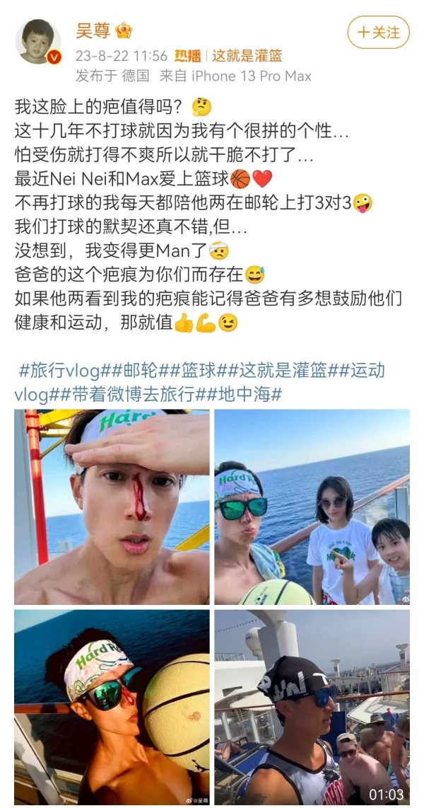 吴尊晒照称陪儿女打篮球脸部受伤,却说“那就值”!