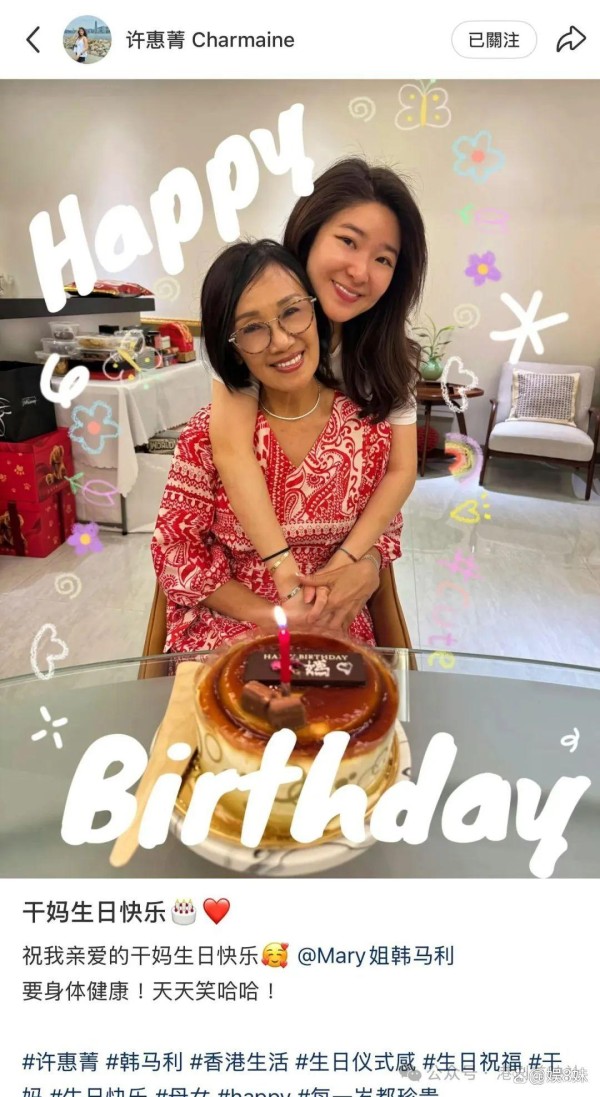 许惠菁分享与韩马利庆祝生日的片段,韩马利穿上橙红色长裙,精精神神,她兴奋地吹熄蛋糕上的蜡烛。许惠菁揽住契妈影相,蛋糕写上“HAPPY BIRTHDAY 契妈”,相信一定令韩马利甜入心!韩马利71岁依然靓靓女女,绝对保养得宜。