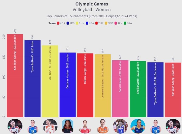 从2008年北京奥运会到2024年巴黎奥运会,众多非凡的个人表现被载入史册。这些表现不仅彰显了选手们卓越的技术与顽强的毅力,更深刻诠释了奥林匹克精神的核心要义。在所有选手中,金软景以一骑绝尘的姿态稳坐世界排名榜首。特别是在2012年奥运会,她以惊人的207分荣登得分王宝座,不仅技术全面、攻击力超群,更凭借出色的比赛意识和领导力,引领韩国女排在国际赛场屡创佳绩。