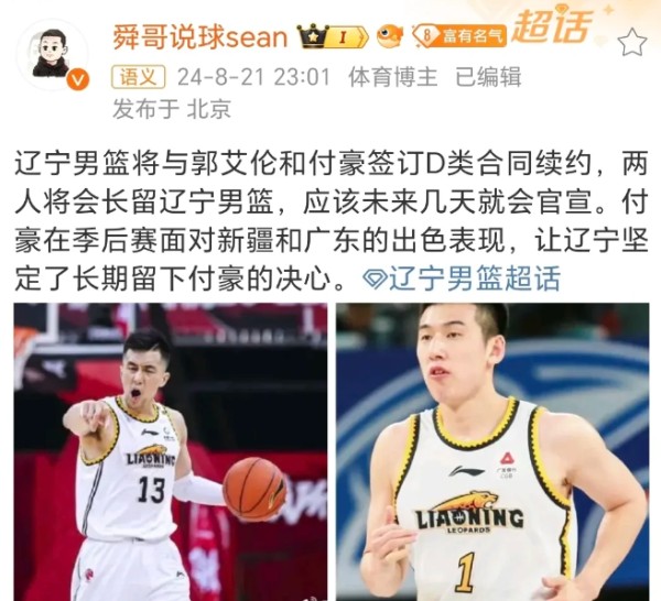 有自媒体透露郭艾伦和付豪将得到辽宁男篮D类顶薪合同,也就宣告了三个事实。