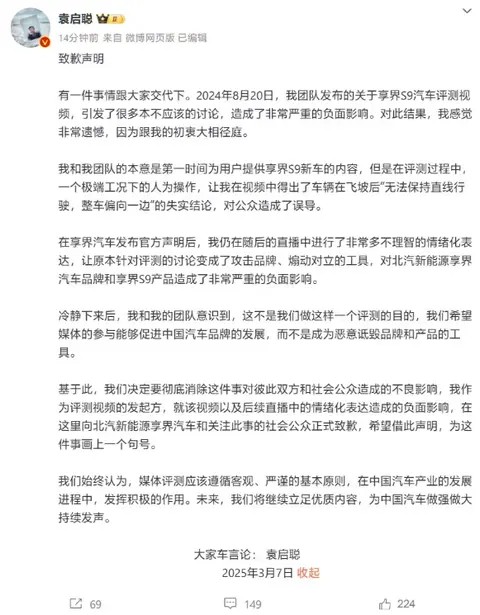 2025年3月7日,知名车评人袁启聪发布致歉声明,承认其团队在2024年8月对华为与北汽合作的享界S9(图片|配置|询价)车型评测视频中得出“车辆飞坡后无法保持直线行驶”的失实结论,并对此造成的负面影响公开道歉。