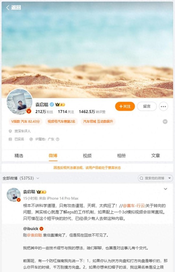 微博CEO回应汽车博主袁启聪被封:可能误会了,禁言一周