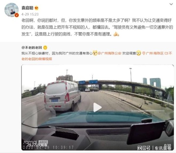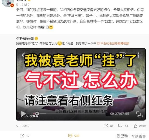 因为上一条微博被袁启聪转发和评论,老回认为他“被挂”了,连忙出一条视频澄清自己的“攻击型驾驶”。自此引起了网友“进攻型驾驶”和“防守型驾驶”的热烈讨论。