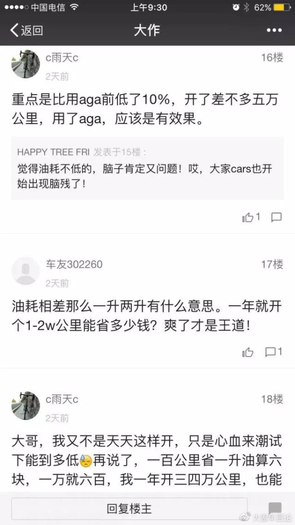 一般用AGA或Pi都会省油一点,也有在某些车型上效果特别显著,甚至有大家CARS的咖友用了AGA后,发现油耗比之前竟然要省多10%: