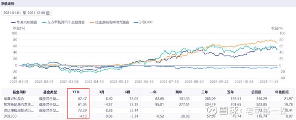 截至12月7日,李家军成员管理的3只基金2021年的收益率均超过了60%,其中信达澳银周期动力混合的年内收益率高达72.29%,其他两只产品收益率分别达到62.47%和61.05%,均大幅超越同期沪深300指数,超额收益非常明显。