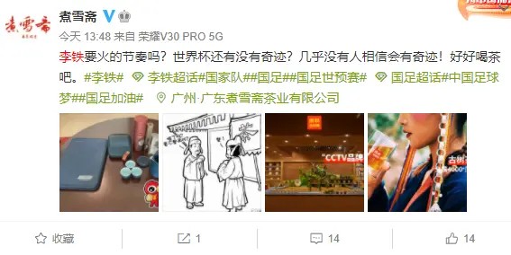 如今李铁的形象很显然不是很好,这也让一些合作伙伴被连累,其中李铁多次发的自己喝茶的产品,这家赞助商11月18日发文称:“李铁要火的节奏吗?世界杯还有没有奇迹?几乎没有人相信会有奇迹!好好喝茶吧。”