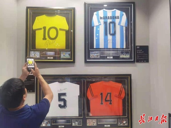 据长江日报记者所见,展馆被分为了若干个区域。其中主办方将“球王”贝利、“上帝之子”马拉多纳、“足球皇帝”贝肯鲍尔,“绿茵飞人”克鲁伊夫等四位传奇巨星的球衣布置在一起。那是足球世界的一段激情岁月,也引得不少市民驻足观看、留影。