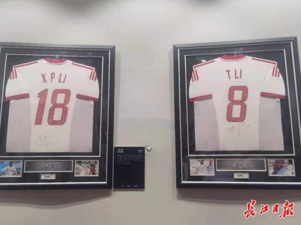 有趣的是,在中国队2002年闯入世界杯的展区内,记者看到8号李铁与18号李霄鹏的球衣并排摆放在一起,而这两位教练恰好是中超武汉队的前任与现任主教练。