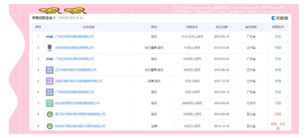 李铁与多家企业深度关联,业务多聚焦于足球体育领域。据天眼查App显示,他共关联9家企业,其中6家目前处于存续状态,涵盖广州仕伯特体育发展有限公司、沈阳李铁足球俱乐部有限公司、广州仕伯特环境科技有限公司(曾用名:广州仕伯特体育设备有限公司)等,均与体育产业紧密相关。李铁关联9家企业,主要涉足体育产业,如足球俱乐部、幼儿足球教育,并担任多个公司要职。在这些企业中,李铁均占据股份,并担任要职,如沈阳李铁足球俱乐部有限公司和辽宁李铁体育文化发展有限公司的执行董事,以及沈阳天意体育文化咨询服务有限公司的监事。