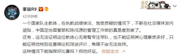 值得一提的是,在训练开始之前,李铁就发了一条关于伊朗地震了的消息。而这也引起了媒体人李璇的质疑。“一个国家队主教练,在执教战绩惨淡、饱受质疑的情况下,不断在社交媒体发内涵贴,中国足协国管部和陈戌源的管理工作真是差到家了。还有,这无法证明这位教练心无旁骛专注带队,也不能证明其心理素质多好,只能证明他特别在意舆论和球迷评价,焦躁不安无法自持。这种情况下能指挥好比赛吗?祝他好运”。