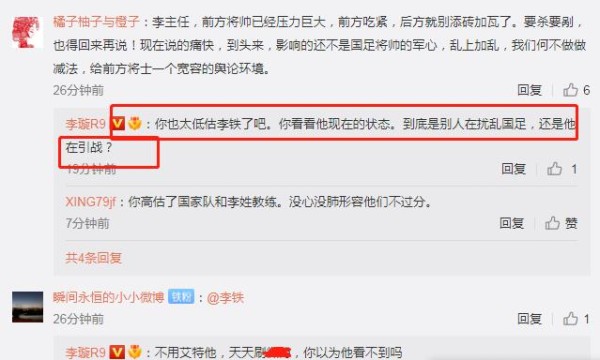 而有球迷则建议李璇,李铁和国足的压力已经够大了,等打完比赛回国之后,谈论批评国足也不晚,这么一直批评李铁,容易扰乱军心。而李璇则认为李铁频繁发文,是故意引战,“你也太低估李铁了吧,你看看他现在的状态,到底是别人在扰乱国足,还是他在引战”。李璇还表示,不用特意艾特李铁,他天天刷社媒,肯定能看到。
