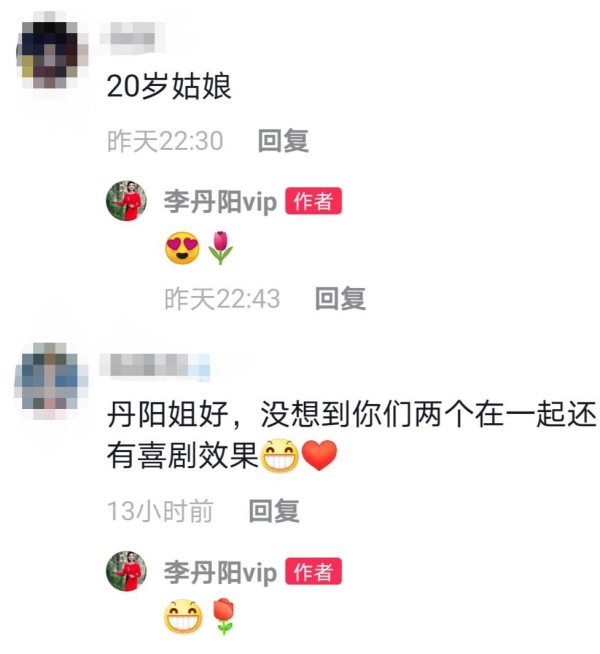 很多网友看到后也给她留言称“20岁小姑娘”。李丹阳今年55岁了,但岁月没有在她身上留下过多痕迹。还有网友说“丹阳姐好,没想到你俩在一块还可以有喜剧效果”,也获得了李丹阳的回复,李丹阳对待粉丝就像对待朋友一样。