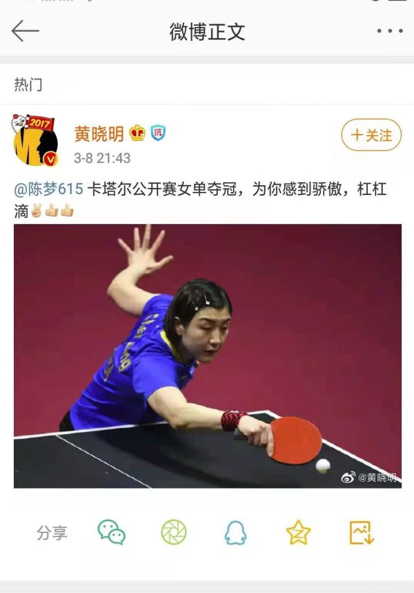 乒乓球奥运选手陈梦 居然是黄晓明表妹