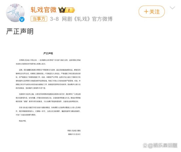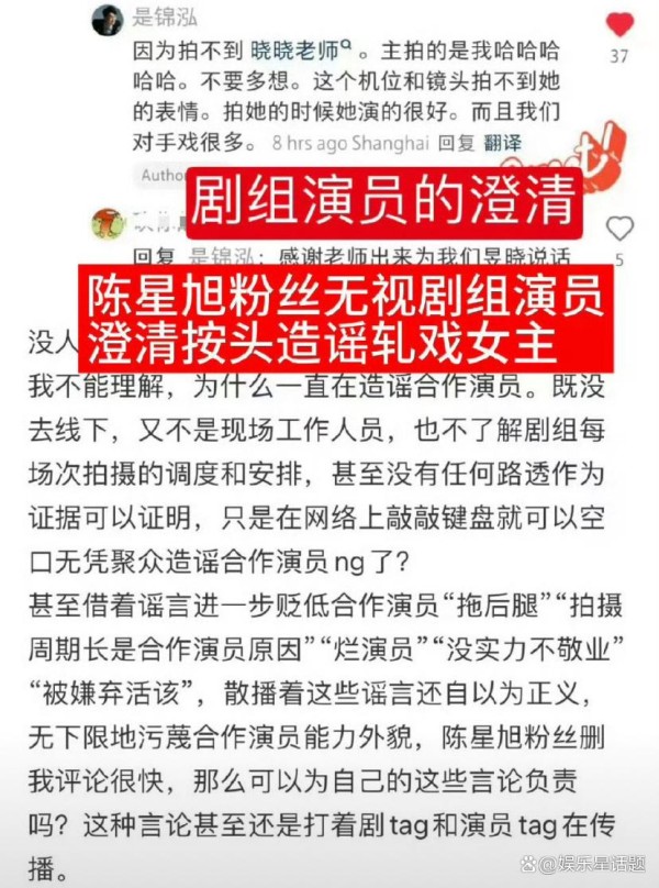 《轧戏》剧组早在3月8日就发布声明,强调将对恶意攻击主演的行为采取法律手段。陈星旭工作室也启动全面取证工作,坚决维护艺人合法权益。值得注意的是,这并非该剧首次陷入争议,此前卢昱晓因在开机仪式上看陈星旭的眼神就引发过“发春”等不当言论。