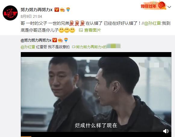 果不其然,今天翻看俩人的微博就发现了非常搞笑的一幕。张艺兴在剧中是骂的痛快了,但是在剧外却慌忙认错。在孙红雷发微博之后,张艺兴立马道歉:哥,一时的父子一世的兄弟,在认错了,已经在好好认错了!从张艺兴的言语中能明显看出,他还是非常害怕孙红雷会因此生气的。