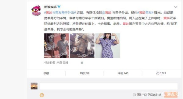 近日有媒体曝光,黄龄和一个陌生男孩一起甜美逛街的照片曝光,瞬间引发了大家的热议和猜测,黄龄和那个男人非常亲密,黄龄一会儿挽着男方的胳膊,一会儿牵着男方的十个手指。之前,黄龄曾在节目中大方地公开了自己的恋爱经历,说“我不单身,怎么可能单身”。每个人都在猜测她男朋友是许篙,但这次却让每个人失望了。