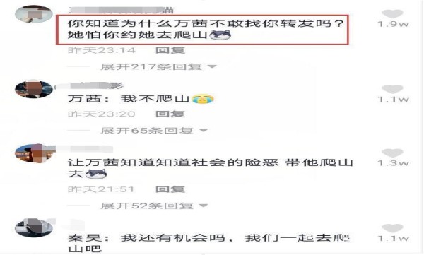万茜不敢爬山,秦昊成为噩梦,怕被“拍照”落下山。之前秦昊在直播间就表示,自己没有收到万茜的邀请帮其宣传,已有“不满”。而网友也表示:“万茜是怕和你走太近了,会被约去一起爬山。”