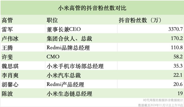 吃到甜头之后,雷军趁热打铁,带领下属“组团”加入网红赛道。包括小米集团合伙人、总裁卢伟冰,小米集团副总裁兼集团CMO许斐,以及小米中国区市场部副总经理、Redmi品牌总经理王腾等多位小米高管均已经开设了自己的社交账号,他们的人设定位各有不同,相互串台,以此打造网红账号矩阵,更全方位的向市场展示小米。
