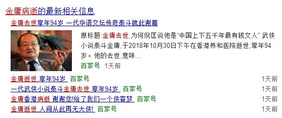 10月30日,武侠小说泰斗金庸于香港养和医院病逝,享年94岁。