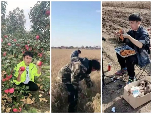 他可以拿起镰刀割稻谷,他可以到果园摘苹果,他也可以在田间地头,支起炉子边烤红薯边直播带货。