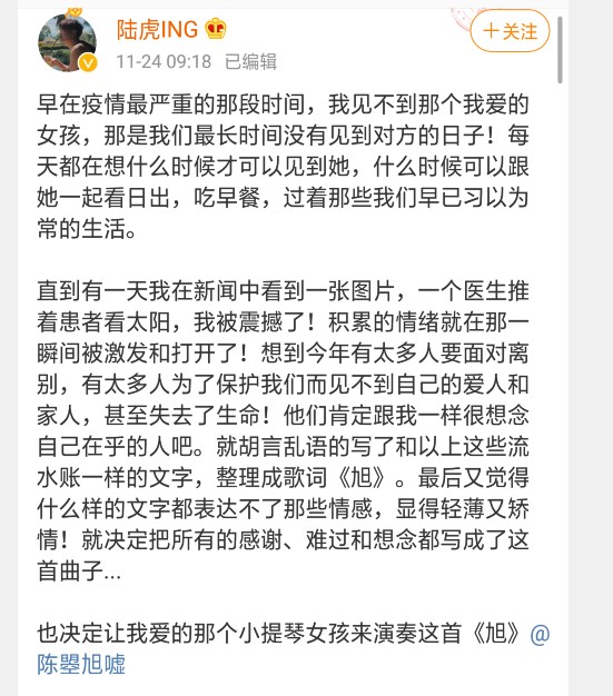 今日,陆虎公布了恋情,陆虎是一个长相英俊的男人,是国内男歌手、演员、作曲人、音乐制作人,出演过《一起来看流星雨》,为《延禧攻略》、《鬓边不是海棠红》作曲并演唱了主题曲,从他的履历可见这个人的优秀之处,陆虎发博文称:“早在疫情最严重的那段时间,我见不到那个我爱的女孩,每天都在想什么时候才可以见到她,想到太多人跟我一样想念自己在乎的人,就写了《旭》,也决定让我爱的那个小提琴女孩来演奏这首《旭》。”原本只是想推出这首歌曲,但却坦诚地承认了自己的恋情,也是一举两得,但十分尴尬的是,陆虎居然艾特错了媳妇,这一点让本是浪漫的告白变为了乌龙。