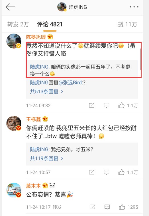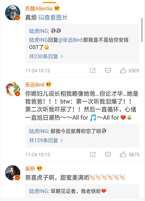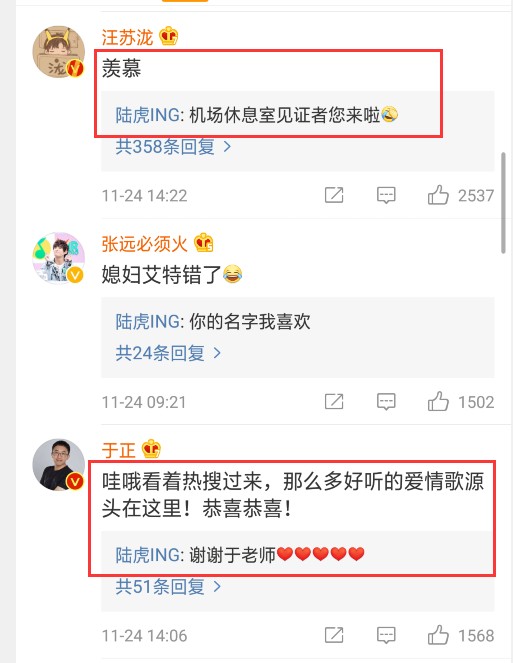陆虎在圈内的人脉还是不错的,在他的评论区我们看到了很多熟悉的名字,如张远、苏醒、吴昕、于正、王栎鑫、汪苏泷等人,吴昕是陆虎的老铁,也是这段恋情的最早见证者,她的祝福让陆虎很开心,于正和陆虎之间有过合作,为此这一次“死丫头”的话还是很不错的,称赞了陆虎的才华,也表达了对于这段爱情的认可,陆虎的回应也很温馨,苏醒晒出了一张图表示“真烦”,估计在间接地表达一位单身狗的困扰吧,张远的留言就很接地气了,述说了自己被陆虎媳妇调侃的点滴。