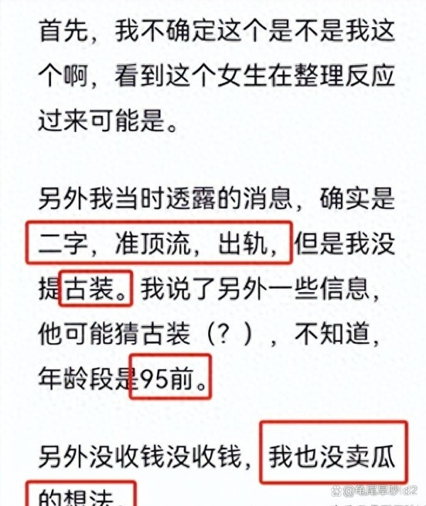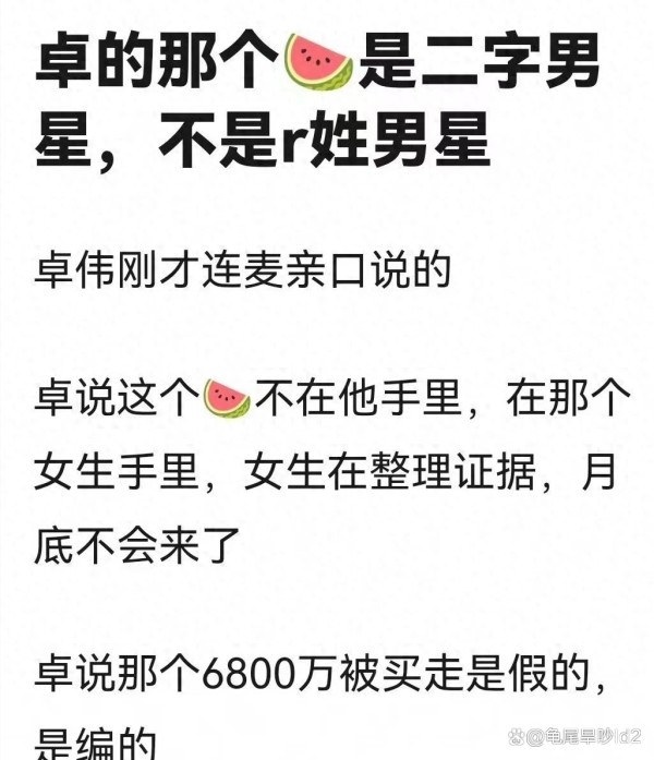 这位神秘女生的发言,似乎才是真正掌握了大瓜的源头所在。她手上的瓜才是货真价实的,而卓伟只是个传话筒。她并没有明确提到古装题材,也许她说的是其他方面的内容,导致人们误以为指的是古装。不过这些都不重要了。重要的是,这个女生爆料的核心信息仍然与之前的传闻保持了一致,那就是准顶流男星的生活作风的传闻。