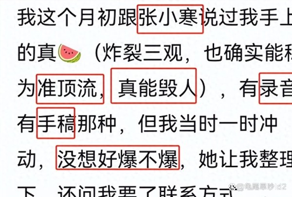 这位神秘女生透露,月初时她曾与张小寒交流过,谈及自己手上握有震撼三观的瓜,涉及一名准顶流男星,并表示有录音和手稿作为证据。然而,她当时并未决定是否公开爆料。张小寒建议她先整理资料,并询问了她的联系方式。