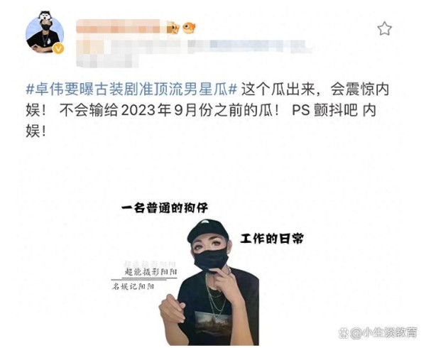 近日,一位曾经风光无限的娱乐圈狗仔卓伟,突然宣布要揭露一位古装剧准顶流男星的出轨瓜,这一消息立刻在网络上引起了轩然大波。
