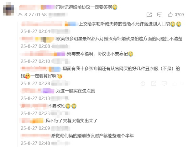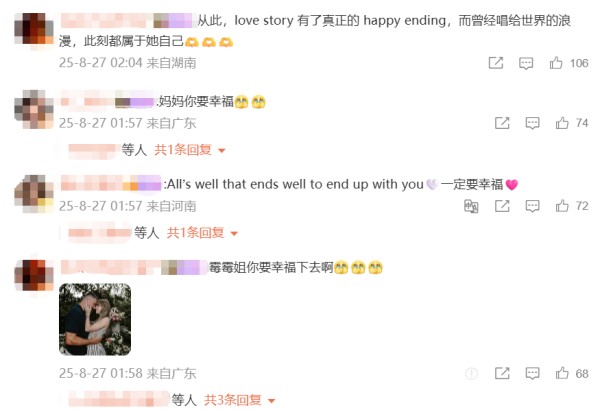 也有粉丝提醒霉霉签婚前协议、不要改姓,被赞是“实在建议”。