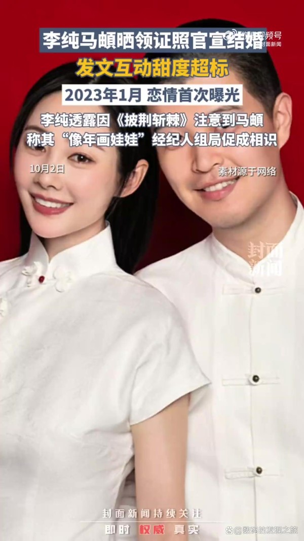 红底照片里的两个人穿着简单白色上衣,肩膀自然靠在一起,马頔嘟嘴作势亲吻李纯,没有华丽的布景,只有两张洋溢着幸福的脸。“恭喜你哦!”10月2日中午12点,演员李纯和民谣歌手马頔在社交媒体上同步发出这句简单的文案,@了对方,并配上了结婚证照片。这条消息瞬间引爆热搜,不到一小时收获超过十万祝福。
