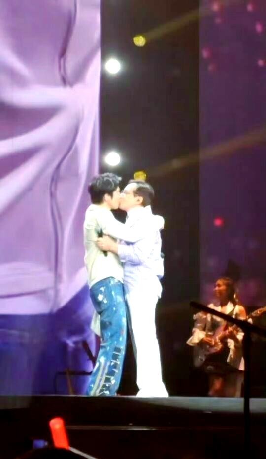 然而,就在昨天(2日),成龙又出现在金曲歌王王力宏的深圳演唱会上,并与王力宏在台上上演了男男嘴对嘴的亲吻戏码。这一画面曝光后,立即引发了广泛的热议。在王力宏演唱会上,成龙与他上演男男吻,引发热议。