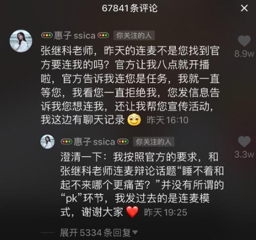 虽然惠子声明否认了是要与张继科PK,强调只是要与他连麦而已,但是从当天的直播来看,惠子确实想要与对方PK 的,所以也难怪张继科会拒绝惠子的邀请了。