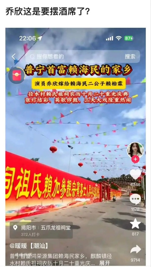 只不过,自爆出两人恋情以来,他们都从未正面回应过,直到最近有普宁的网友拍到赖式家族的婚宴酒席并表示乔欣嫁给恺柏霖。
