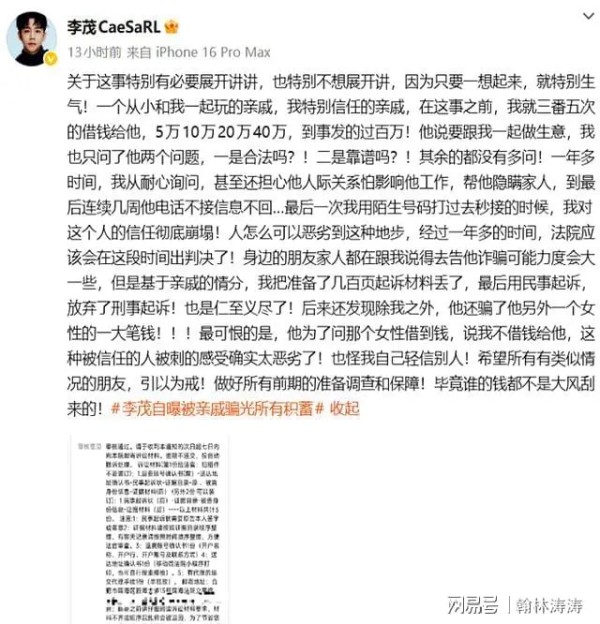 李茂的故事在社交媒体上引起了广泛讨论,公众的反响不仅集中在他个人的遭遇上,更引发了对信任、亲情与经济关系的深刻思考。