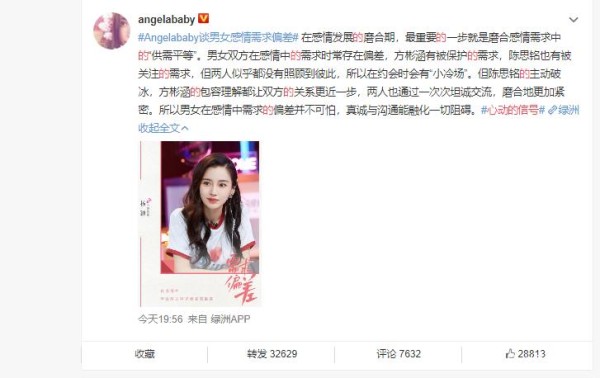 就在大家对方彬涵和陈思铭议论纷纷的时候,杨颖谈在自己的社交平台发文谈起了男女感情需求偏差的问题,杨颖称:男女在感情中需求的偏差并不可怕,真诚与沟通能融化一切阻碍。在感情发展的磨合期,最重要的一步就是磨合感情需求中的“供需平等”。小伙伴们看到杨颖的评价也是纷纷大赞确实是这样的。