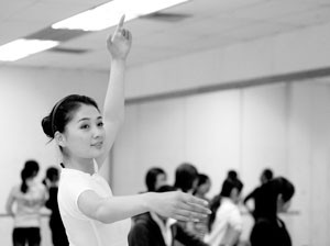 这位美丽高挑的“明星学姐”跟练功房的同学们都打成一片了。她的同学们见记者来拍照,也很大气地配合。