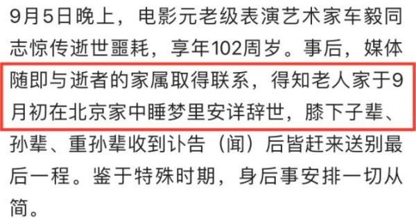 近日,娱乐圈再次传出噩耗,上帝又带走了一位元老级表演艺术家。不过让人欣慰的是,生前她并未承受任何痛苦,是在睡梦中安详去世,享年102岁,她就是车毅。