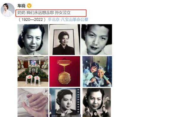 随后,车晓通过社交账号发文悼念奶奶,短短13字却透露出心痛与遗憾,称奶奶,我们永远怀念您,孙女泣立。