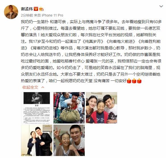 虽然奶奶离世悲痛万分,但谢孟伟还是发文宽慰大家,让大家不要太难过:“如今奶奶走了,可是她的笑容永远留在了我们的脑海里,观众朋友们永远怀念她。大家也不要太难过,奶奶只是去了另外一个空间继续着她热爱的表演了,咱们一起祝愿奶奶在天堂 没有痛苦 一切安好”,字字句句都戳中泪点,太催泪了。
