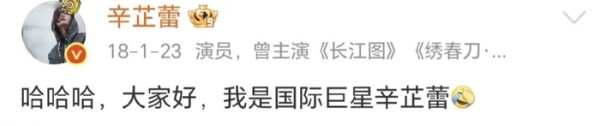 早在2018年1月,她便在微博上写下:“哈哈哈,大家好,我是国际巨星辛芷蕾。”