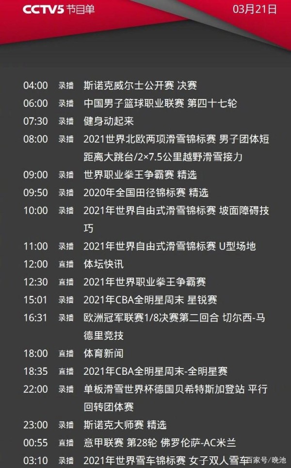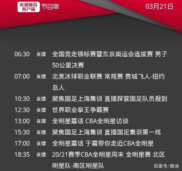 北京时间2021年3月21日(周日),中央广播电视总台已经通过官微发布了体育频道(CCTV5)、央视体育客户端(CCTV5APP)和体育赛事频道(CCTV5+)今日最新节目单。周末央视体育赛事直播精彩纷呈好戏连台,将上演足球、篮球、冰球、竞走比赛和专题节目。